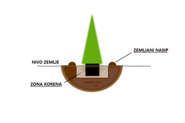 Poželjno je da oko zone korena napravite "čanak" - mali kružni nasip koji zadržava vodu. Tako će se vlaga pravilno proceđivati u zonu korena.